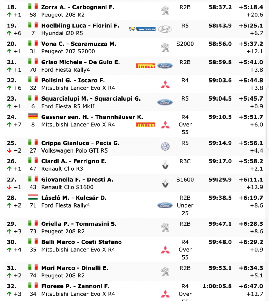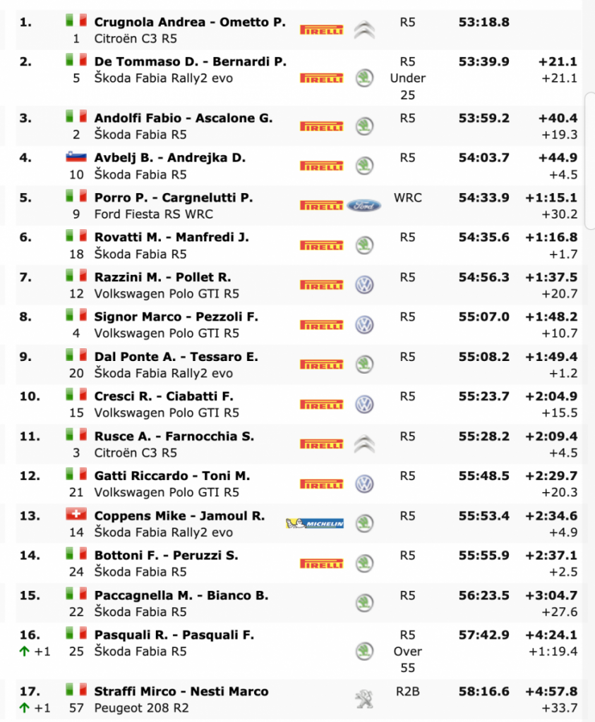 Damiano De Tommaso y Patrick Bernardi (Skoda Fabia R5) terminaron segundos a 21.1 del líder. El actual campeón del IRCup sufrió en el debut de su nuevo copiloto y de la montura, que llegó unos días antes del inicio de la carrera. «Estuvimos haciendo un shakedown general porque nunca es fácil correr con un nuevo copiloto. Comenzamos a trabajar bien con el equipo y aunque no mantuvimos un ritmo muy alto, luché por mantener mi trayectoria en la cita», explicó el segundo clasificado.