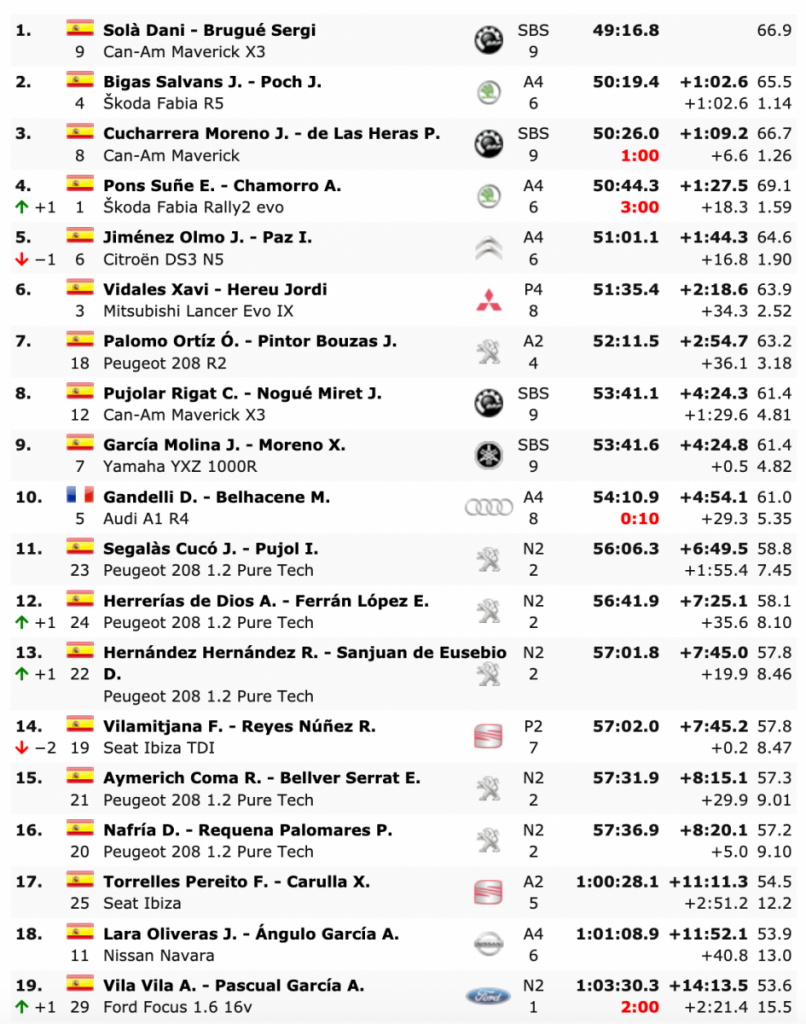 Josep Bigas Salvans y Jaume Poch (Škoda Fabia R5) fueron los segundos clasificados a 1:02.6 de los ganadores después de la disputa de siete tramos cronometrados. Terceros finalizaron Jesús Cucharrera y Pau de Las Heras (Can-Am Maverick), a solo 6.6 del segundo puesto.
