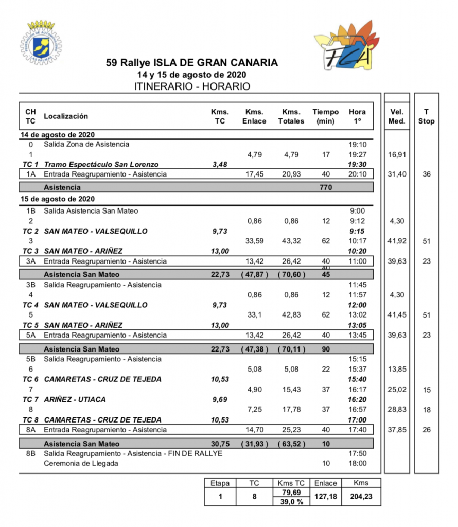 Y por ese motivo, la organización ha decidido adelantar la hora del tramo espectáculo del viernes 14 agosto en San Lorenzo (3,48 km) a las 19.30, para que se haga todo de día. El sábado 15 de agosto se realizarán las mismas especiales que en la edición 2019, aunque en algunos casos con recorrido recortado. Los equipos pasarán por los tramos de San Mateo-Valsequillo (9,7 km), San Mateo-Ariñez (13 km), Camaretas-Cruz de Tejeda (10,5 km) y Ariñez-Utiaca (9,6 km), siendo la sede y el final del rally en San Mateo.