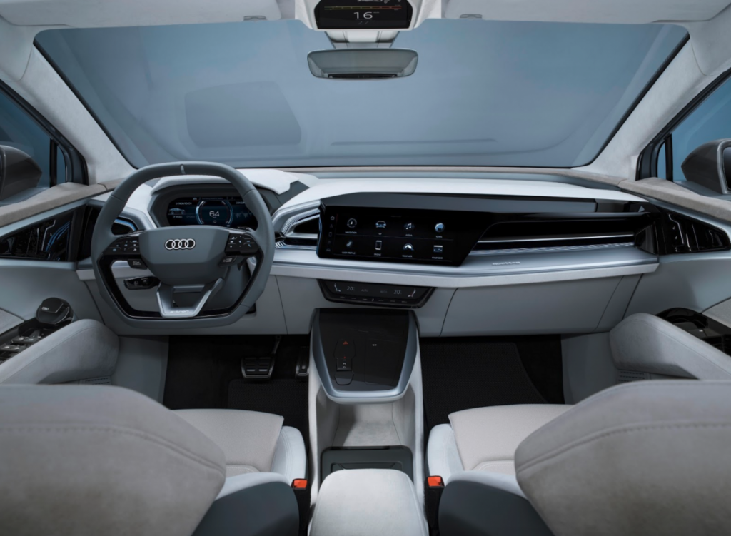 La combinación de colores enfatiza la sensación de amplitud. Mientras que los tonos claros y cálidos dominan la sección superior, el tapizado oscuro en la parte inferior proporciona un contraste. El techo, los pilares de las ventanillas, la sección superior de las puertas y el salpicadero están tapizados con tejido de microfibra blanco y beige. La sostenibilidad es la máxima prioridad en lo que respecta a la tracción eléctrica de los Audi Q4 y Q4 Sportback: el revestimiento del suelo está fabricado con materiales reciclados. En lugar de marcos decorativos de metal cromado, las superficies están cubiertas con un acabado de pintura multicapa de alta calidad. Los cuatro asientos con reposacabezas integrados están tapizados con un acogedor material de Alcántara, fabricado con una exquisita elaboración. Unas costuras dobles cosidas con hilo grueso adornan la tapicería.