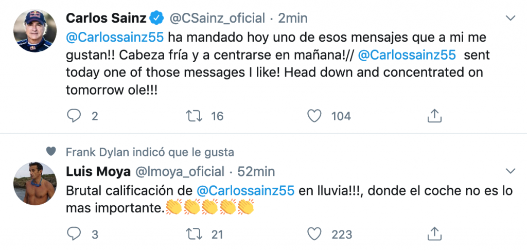 «Estoy muy feliz, porque éste es mi primer tercer puesto en calificación de mi carrera (en Fórmula Uno), en unas circunstancias muy complicadas», explicó Sainz tras una dura jornada marcada por las lluvias torrenciales que obligaron a suspender el tercer entrenamiento libre, primero; y, después a retrasar el arranque de la calificación.