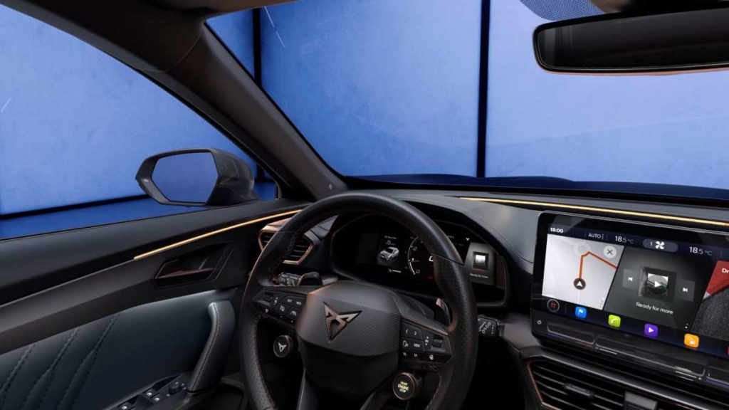 – Dentro del Formentor. Una vez en su interior, pueden observarse los detalles de un modelo de altas prestaciones: asientos bucket de serie, pantalla táctil de 12” con sistema de navegación, tablero en petrol blue con doble puntada en copper y volante deportivo con botones integrados y modo CUPRA.