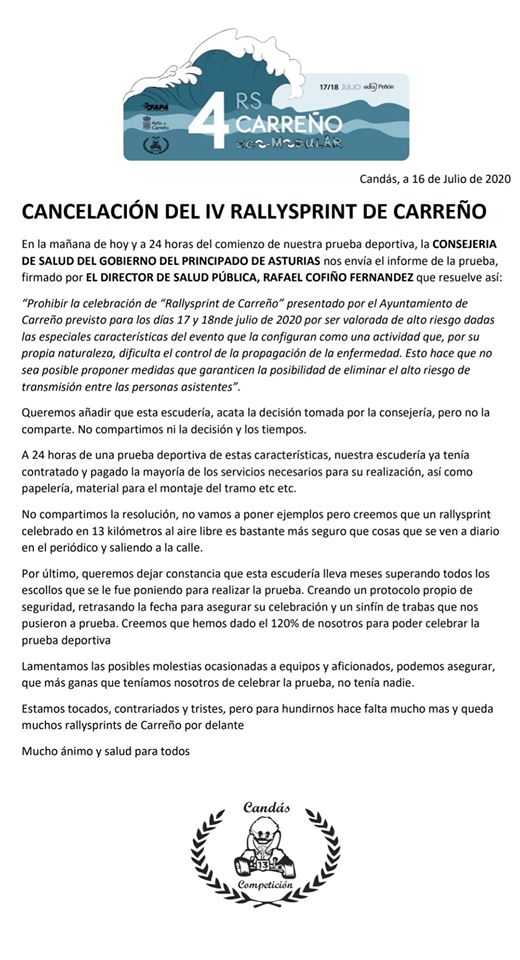 La Consejería de Salud del Gobierno del Principado de Asturias ha prohibido la celebración del IV Rallysprint de Carreño.