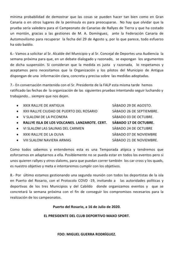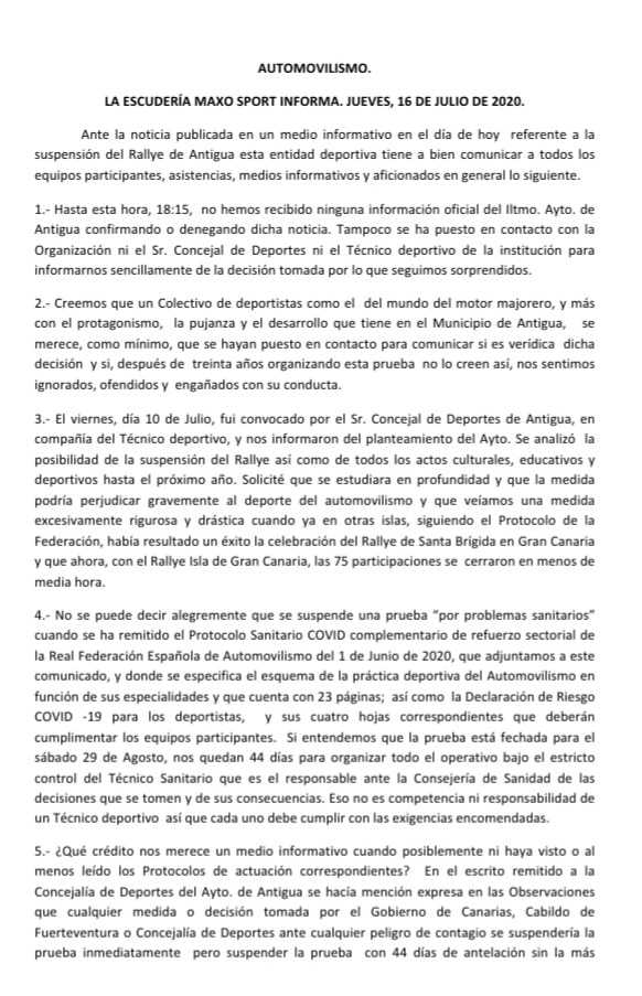El CD Maxo Sport, por medio de un comunicado, se ha mostrado sorprendido por la suspensión del XXIX Rallye Antigua (Fuerteventura).