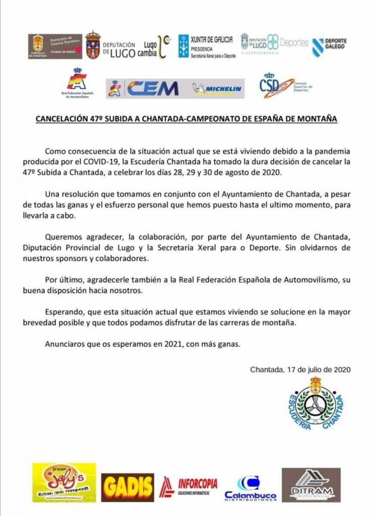 Cancelada la Subida Chantada, cita puntuable para el CEM Por Rafa León En 20/07/2020 19:13 Compartir FacebookTwitterWhatsAppEmailTelegramLinkedin Cancelada la Subida Chantada, cita puntuable para el Campeonato de España de Montaña (CEM). Campeonato de EspañaChantadaEspañaSubida a Chantada Compartir