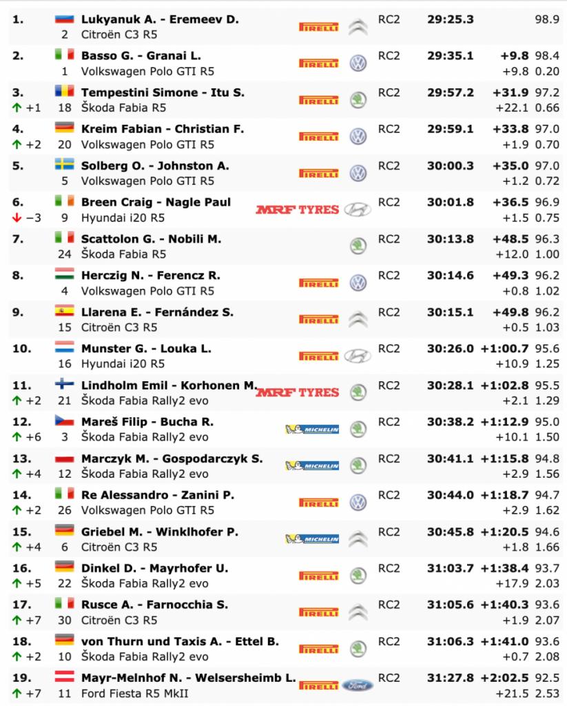 Terceros son los rumanos Simone Tempestini y Sergiu Itu (Škoda Fabia R5), que están a 31.9 de la cabeza, a 22.1 del segundo lugar y a 1.9 de los alemanes Fabian Kreim y Frank Christian (Volkswagen Polo GTI R5), cuartos, que tiene justo detrás al noruego Oliver Solberg y el irlandés Aaron Johnston (Volkswagen Polo GTI R5), a 1.2. La lucha por la última plaza del podio está cara puesto que los irlandeses Craig Breen y Paul Nagle (Hyundai i20 R5) son sextos a 1.5 del quinto lugar, a 2.6 del cuarto y a 4.5 del tercero.