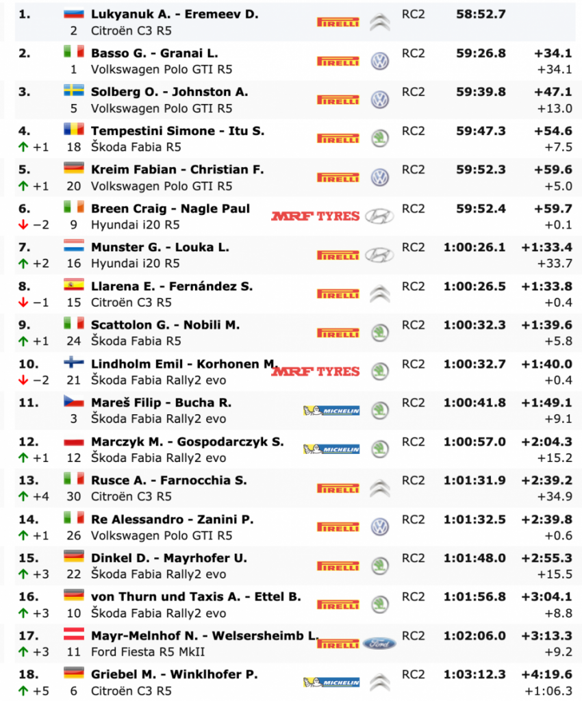 Terceros se han situado el joven noruego Oliver Solberg y el irlandés Aaron Johnston (Volkswagen Polo GTI R5), que están lejos de la cabeza y han superado a rumanos Simone Tempestini y Sergiu Itu (Škoda Fabia R5), cuartos, en 7.5, seguidos de alemanes Fabian Kreim y Frank Christian (Volkswagen Polo GTI R5), que de ser terceros han bajado al quinto lugar, estando a 5.0 del cuarto lugar, pero a solo 0.1 de los irlandeses Craig Breen y Paul Nagle (Hyundai i20 R5), que son sextos.