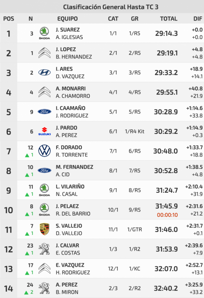 Los gallegos Iván Ares y David Vázquez (Hyundai i20 R5) siguen marcando los terceros mejores tiempos en los tramos, no pudiendo hacer nada por acercarse a los dos primeros, estando a 18.9 del liderato y a 14,1 del segundo lugar, pero sí ampliando segundos respecto a sus perseguidores, los madrileño Alberto Monarri y Alberto Chamorro (Citroën C3 R5), que son cuartos a 21.9 del último escalón del podio.