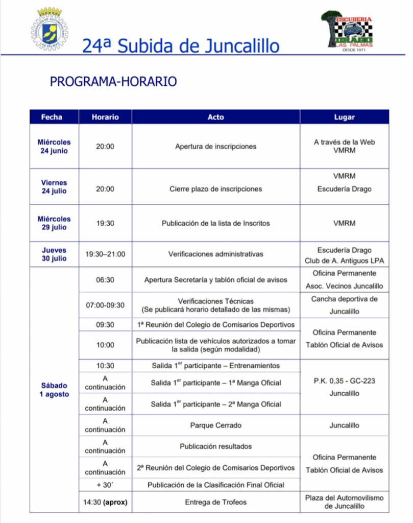 Por otro lado, se produce una modificación del «Programa Horario» con respecto al horario de inicio de las Verificaciones Técnicas en la Cancha de Deportes anexa al Hotel Rural de Juncalillo.