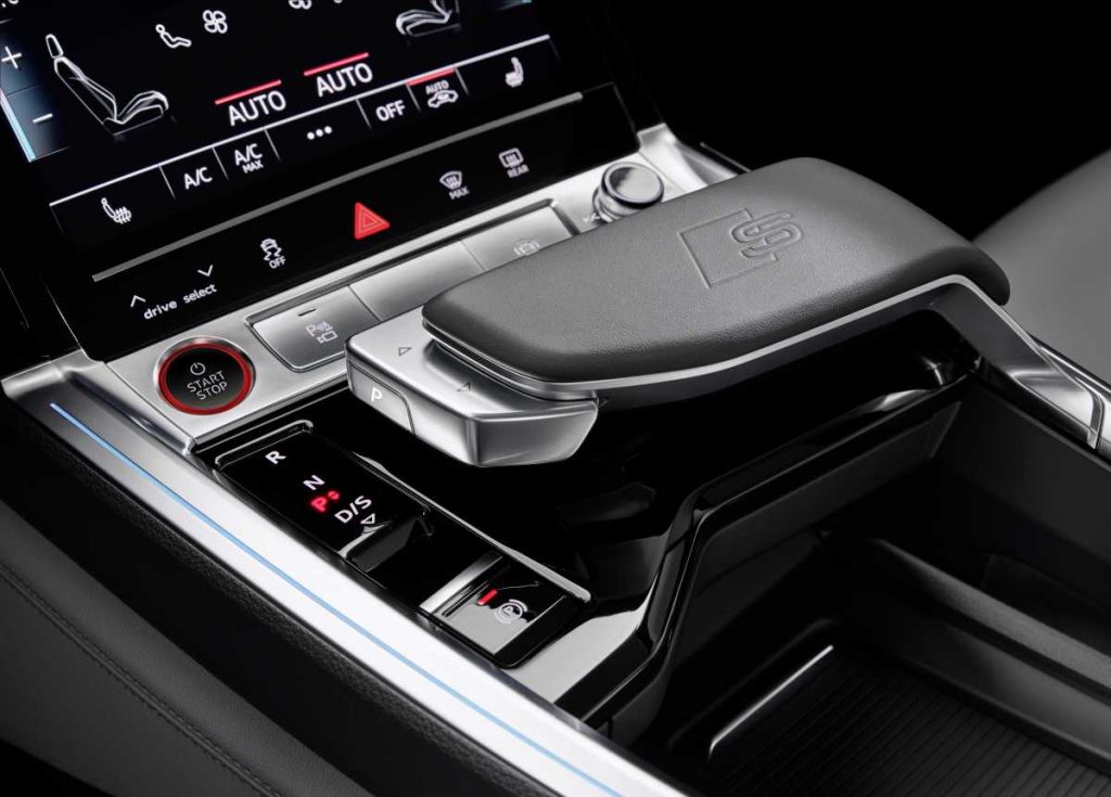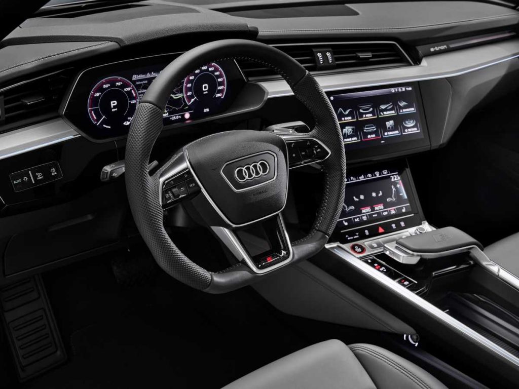 La gran batería de alta tensión, instalada en una posición baja comparable a la de los tres motores eléctricos, asegura un reparto equilibrado del peso entre ambos ejes, lo que reduce la altura del centro de gravedad del coche ofreciendo grandes ventajas en términos de dinamismo. La dirección progresiva, cuya relación se vuelve cada vez más directa a medida que aumenta el ángulo de la dirección, enfatiza el carácter deportivo. La suspensión cuenta con ajustes específicos para los modelos S. El sistema Audi drive select ofrece siete perfiles de conducción. Actúa, por ejemplo, sobre la suspensión neumática adaptativa deportiva; y puede variar la altura de la carrocería hasta 76 mm dependiendo de los ajustes elegidos y de la situación de conducción.