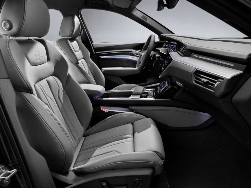 Los tonos oscuros caracterizan el diseño interior de las versiones e-tron S. Los asientos deportivos con ajustes eléctricos forman parte del equipamiento de serie. La tapicería en cuero y Alcántara, así como el pomo de la palanca de cambios, incluyen un rombo en relieve. Las molduras decorativas, realizadas en aluminio cepillado, están disponibles en dos versiones; también se ofrecen de forma opcional en carbono. El paquete de iluminación de contorno/ambiental añade un marcado acento progresivo en la oscuridad.
