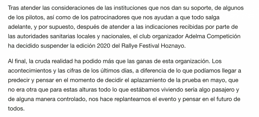 Los organizadores del Rallye Festival Hoznayo se han visto obligados a tener que tomar la dolorosa decisión de tener que suspende su edición 2020.