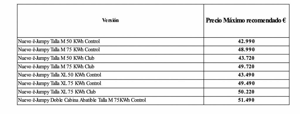 CUADRO: TARIFAS NUEVO CITROËN Ë-JUMPY – 100% ËLECTRIC
