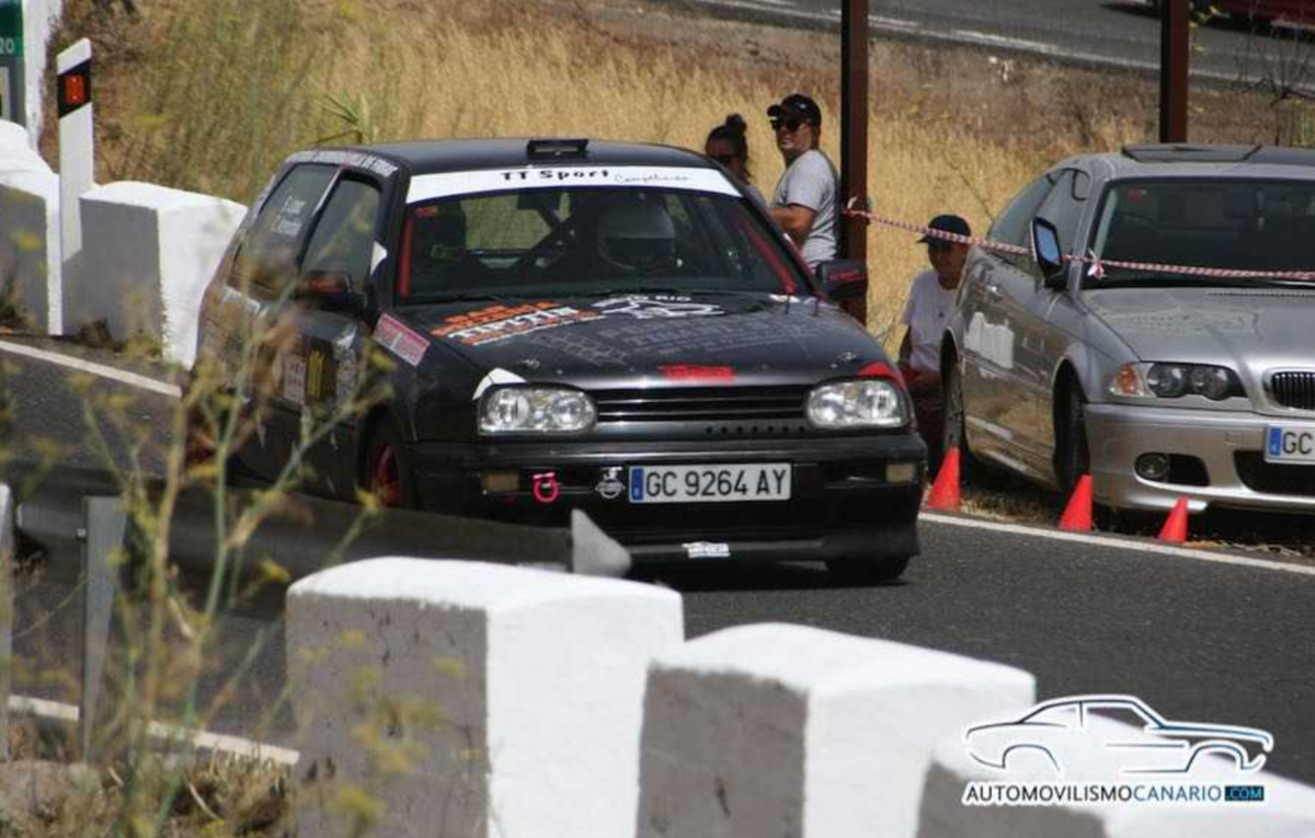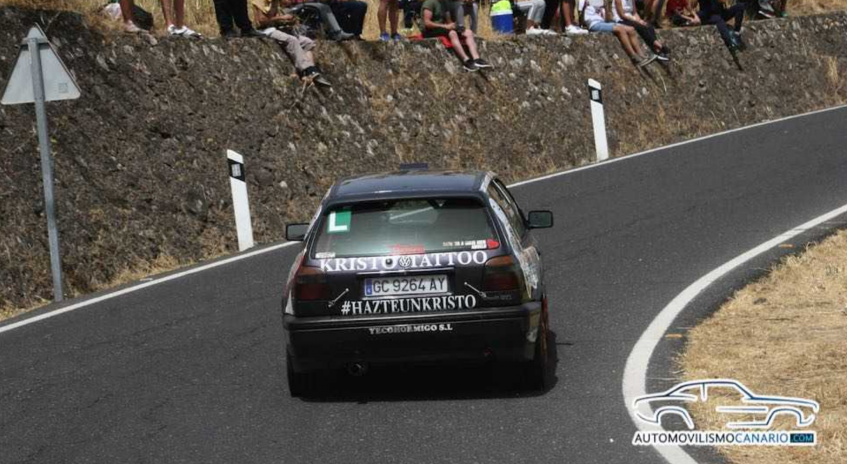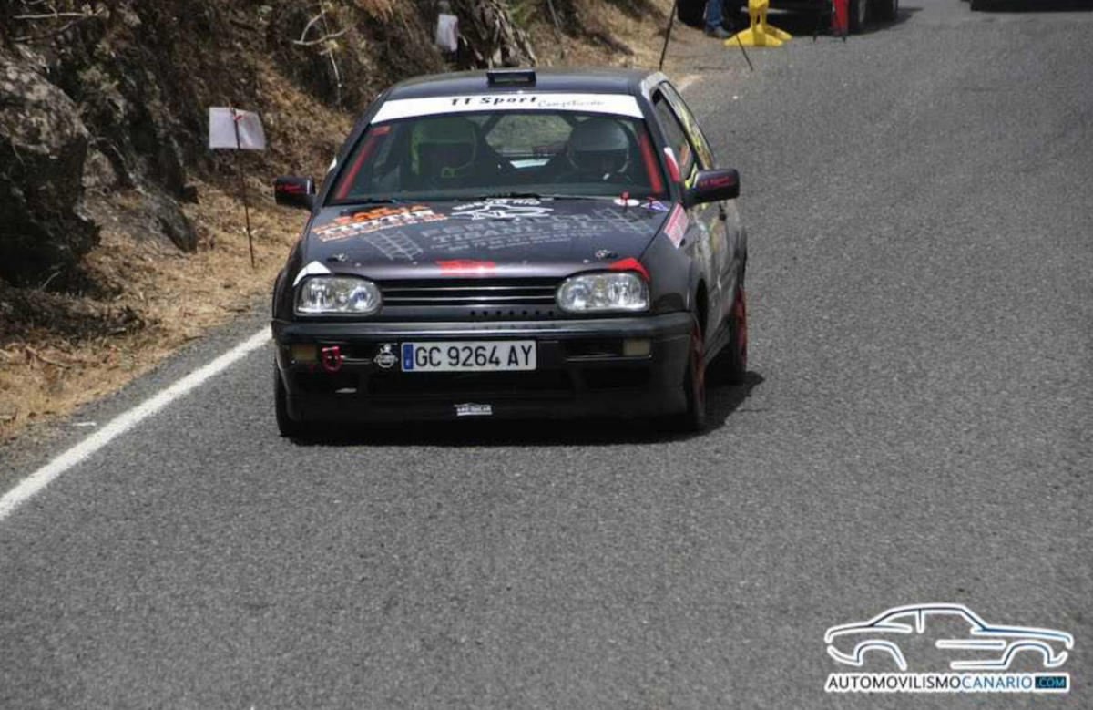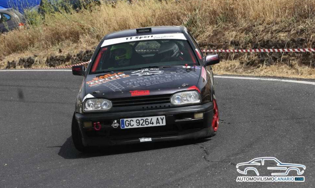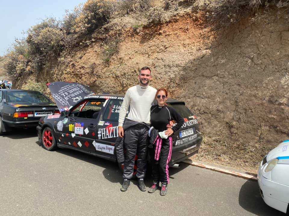Sara López y Christopher Arencibia (VW Golf GTI), del equipo TT Sport Competición, da las gracias a todo los que le apoyaron tras que un problema mecánico les impidió poder terminar la Subida de Juncalillo (Gran Canaria).