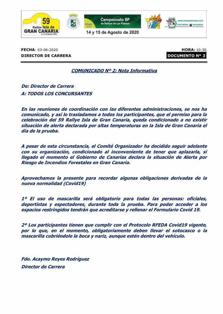 El director de carrera del Rally Isla de Gran Canaria, Acaymo Reyes, emite una segunda nota informativa donde recalca que han recibido el permiso para la celebración de la cita del Campeonato de Canarias y Las Palmas de Rally de Asfalto, aunque quedando condicionado y pudiendo ser aplazado si el Gobierno de Canarias declara la situación de Alerta por Riesgo de Incendios Forestales en la isla.
