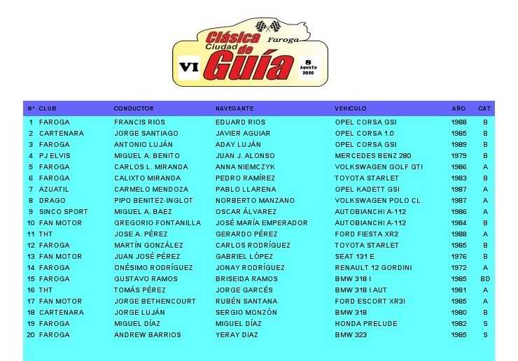 Una vez cerrado el plazo de inscripción por parte de la Escudería Faroga, así quedan los inscritos provisionales, para la VI Clásica Ciudad de Guía.
