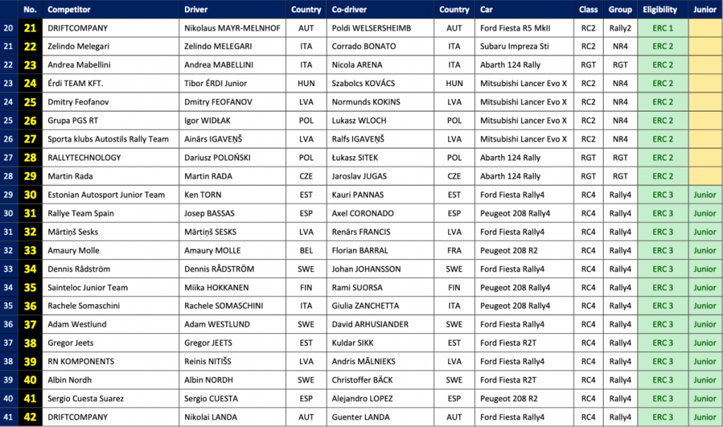 El interés en el Campeonato Europeo de Rallys de la FIA por parte de pilotos y equipos sigue siendo fuerte con 42 equipos registrados para obtener puntos del ERC en el Rally Liepāja, que está programado para el 14-16 de agosto.