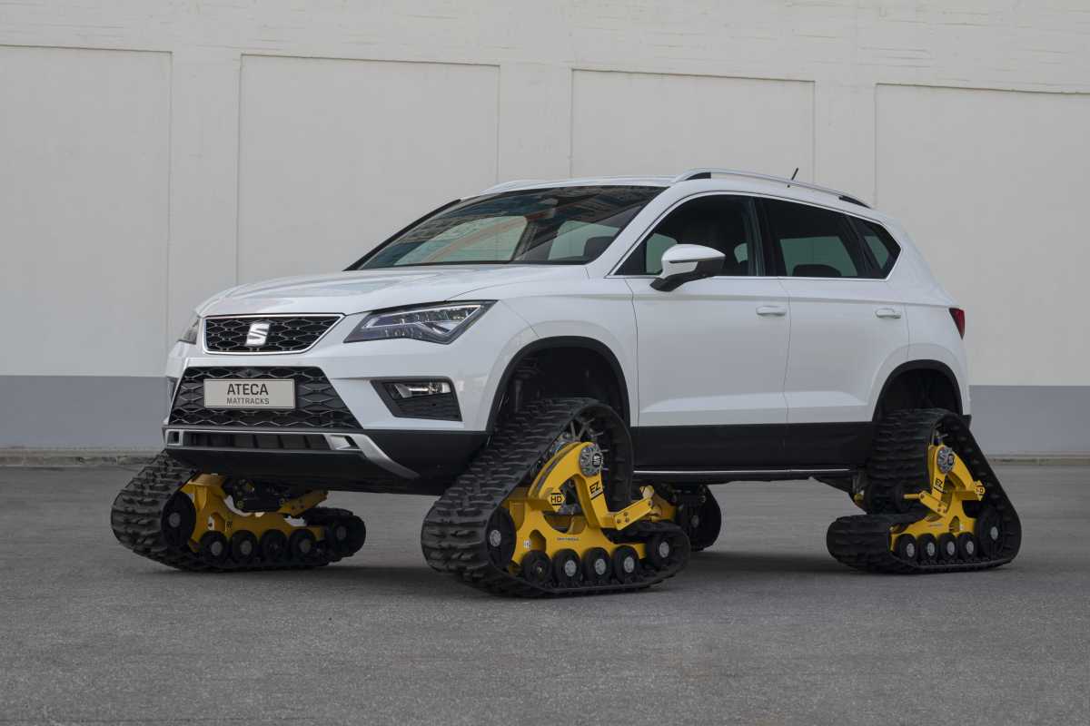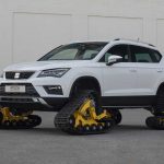 Luego, si de tracción se trata, esa es para el más radical de los SEAT, el SEAT Ateca “Mattracks”. Se realizó para una presentación a la prensa en 2017, el SEAT Ateca Snow Experience. En sustitución de las ruedas de un Ateca 2.0 TDI 190 CV 4Drive, se adaptó un conjunto de orugas producido por Mattracks. Sobreelevado, hiper-ensanchado, su hábitat natural era ya la nieve, pero está homologado para circular por la calle.