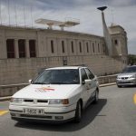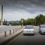 -El coche guía durante la Maratón recorre la Montaña Olímpica de Barcelona junto al eléctrico actual de la marca, el SEAT Mii