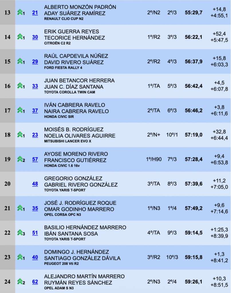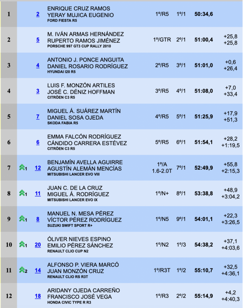 A partir de ahí tomaron el liderato los componentes del equipo Copi Sport, que a pesar de ver como Iván Armas y Pity Ramos, que pasaron a ser segundos, les recortaron algo de tiempo en la quinta especial, pero a partir de ahí Enrique y Yeray, más aclimatados a su nueva unidad, cortaron de raíz cualquier opción a la sorpresa ampliando su renta y acabando con 25.8 sobre los segundos y empezando el Regional con un triunfo que les llena de moral de cara a la lucha por el título.