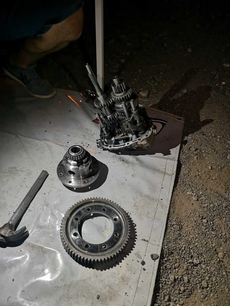 La sorpresa cuando lo ponemos en marcha es que se escuchaba un ruido en la caja cambio, y resulta que empiezo a investigar y me doy cuenta que el autoblocante está algo roto y Joel, dueño del coche, me dice lo que yo decida sobre si retirarse o arreglar la avería. Con la misma le mando a su casa a buscar el repuesto y su asistencia me ayudó para abrir la caja y sacar el autoblocante para poder repararlo y así poder salir al día siguiente. Pues hasta las 2:00 de la madrugada estuvimos trabajando.