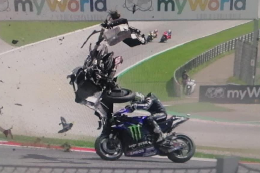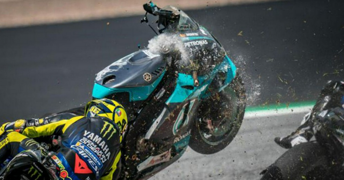 La moto del piloto de Yamaha voló por los aires tras una maniobra de Zarco y pasó a escasos centímetros de Valentino, que se libró de milagro de un impacto que podía haber sido letal.