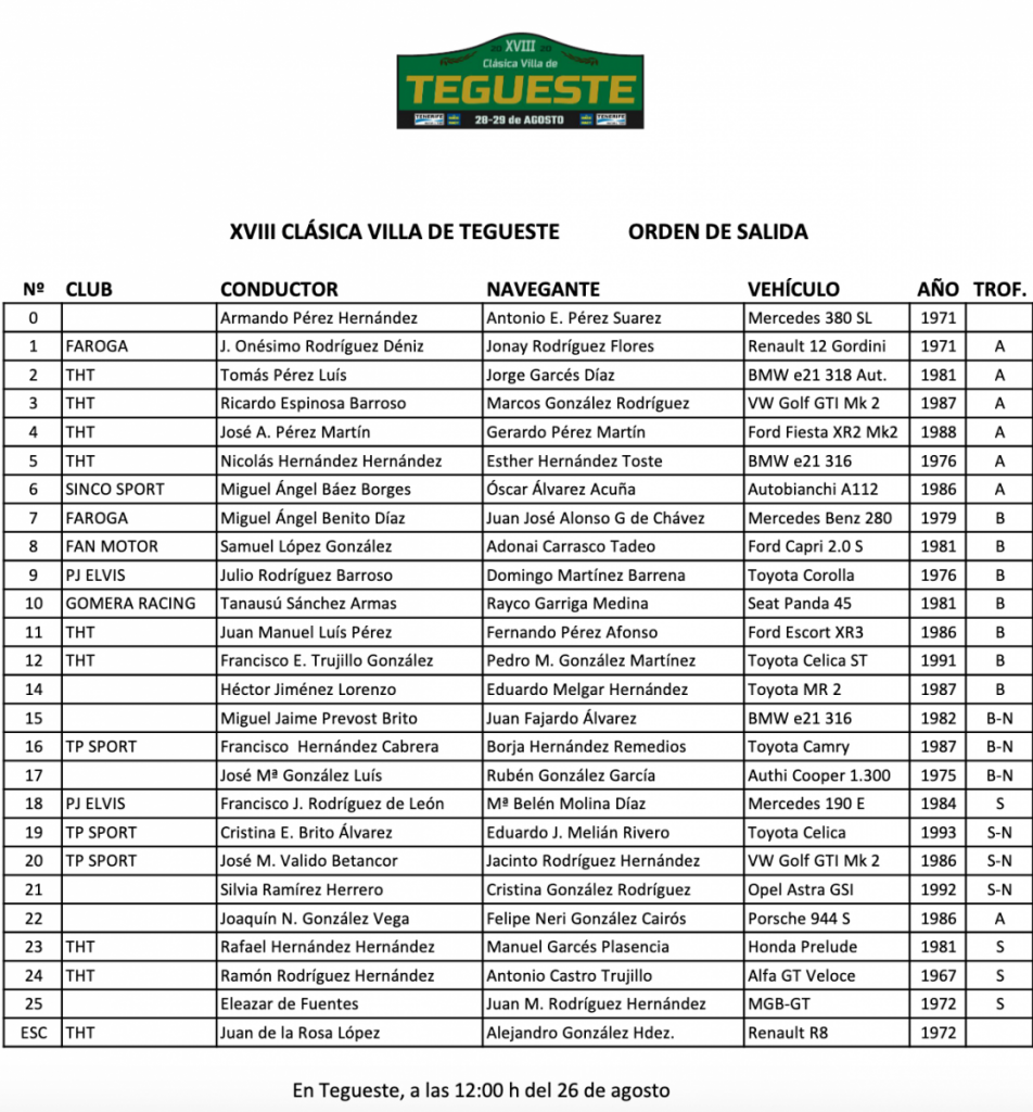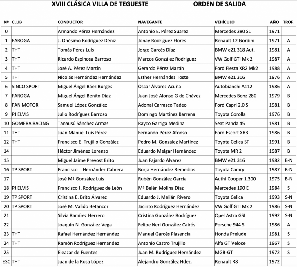 El Tenerife Historic Team hace pública la relación oficial de inscritos de la XVIII Clásica Villa de Tegueste, cita que finalmente y tras unas bajas de última hora asciende a 24 participantes.