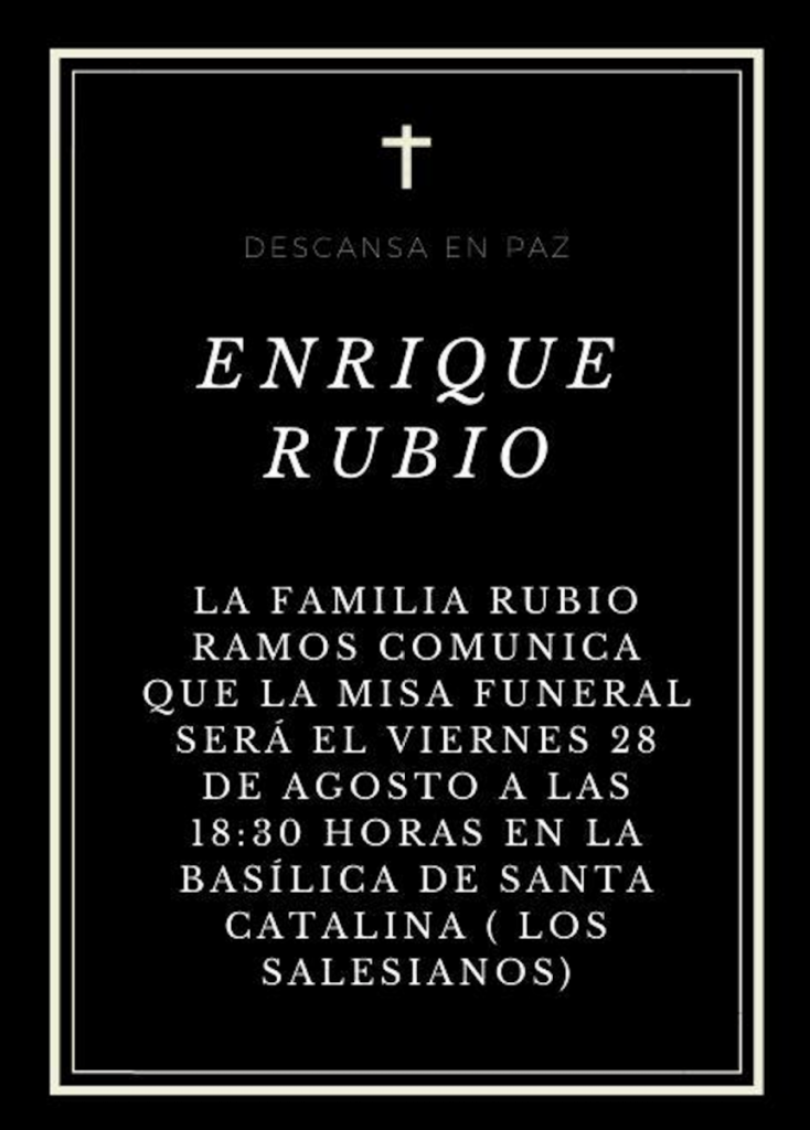 A las 18:30 horas de este viernes tendrá lugar la Misa Funeral por Enrique Rubio en la Basílica de Santa Catalina (Los Salesianos).