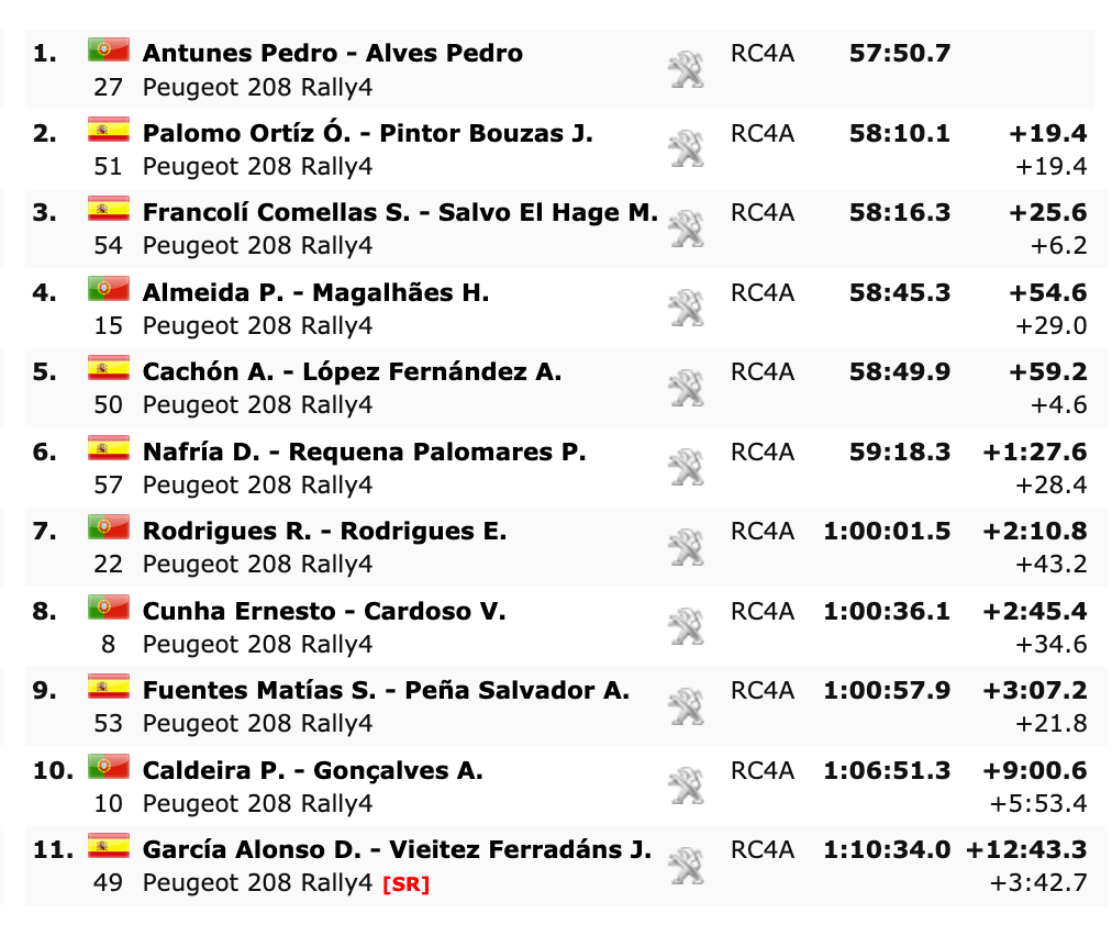 En la primera especial del domingo Sergi Francolí y María Salvo eran lo más rápidos y se ponía líderes, pero a partir de ahí Antunes y Alves pusieron la directa para llevarse el primer triunfo en la competida Copa Peugeot Rally Cup Ibérica superando en 19.4 a Palomo y Pintor, siendo terceros Francolí y Salvo, que se quedaron a 25.6 de la cabeza, a 6.2 del segundo lugar y superando en 29.9 a Pedro Almeida y Hugo Magalhães, cuartos.
