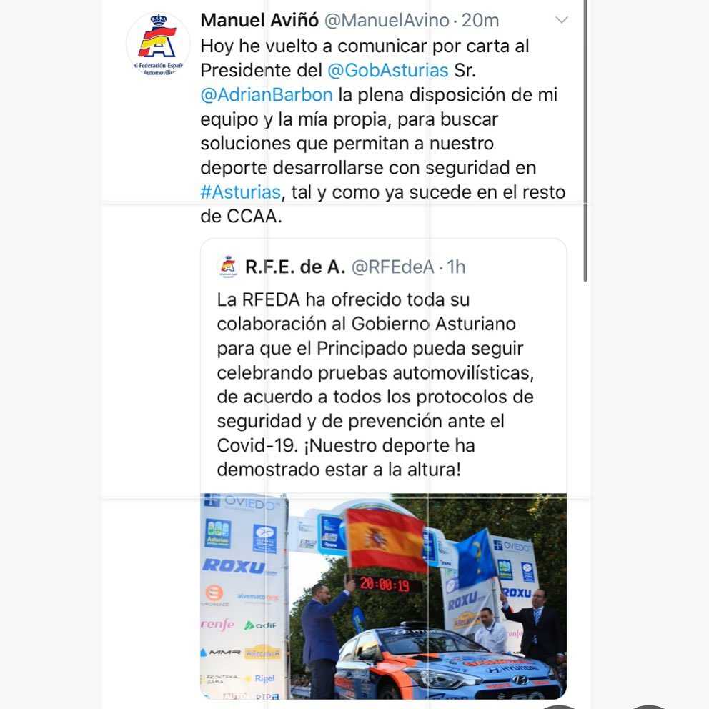 El presidente de la Real Federación Española de Automovilismo, Manuel Aviñó, ha enviado una carta al presidente de Asturias para mostrarle la predisposición de la RFEA para que los rallys se puedan celebrar con normalidad en dicha comunidad.