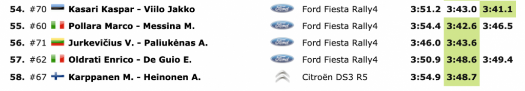 Esapekka Lappi de M-Sport Ford fue tercero, una décima más atrás. El finlandés completó cinco pasadas con su Ford Fiesta, lo que le dio esperanzas tras su falta de test previos a la prueba en comparación con otros de sus rivales y anotando su mejor tiempo en su pasada final.