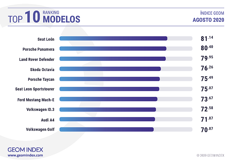 Muy cerca de las posiciones de honor del GEOM Index se situó otra de las marcas protagonistas del mes, en este caso Seat, que además de la cuarta plaza general con 78.14 puntos, se clasificó como la mejor firma generalista del mes. El protagonista absoluto de su gama fue, sin duda, el nuevo Seat Leon, que tanto en su versión estándar como en familiar denominada Sporstourer fue el gran triunfador de la lista de modelos. Otro de los grandes protagonistas fue el nuevo Porsche Panamera, que obtuvo 80.40 puntos y la segunda plaza, mientras que el podio lo completó uno de los modelos míticos todoterreno, el Land Rover Defender, que consiguió 79.95 puntos.