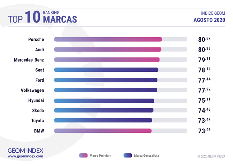 La firma alemana Porsche se convirtió en agosto en la marca más valorada por los internautas españoles según GEOM Index, el índice de referencia para el mercado automovilístico español que tiene en cuenta tanto la opinión de los usuarios en la red como la notoriedad que alcanzan los fabricantes. Porsche se impuso a otras dos firmas premium germanas, ya que Audi y Mercedes-Benz completaron el podio. En el apartado de modelos, el Seat Leon se convirtió en el coche con mejor valoración del mes, mientras que el Porsche Panamera y el Land Rover Defender le acompañaron en las posiciones de honor.