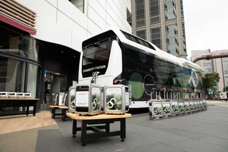 La unidad móvil de generación y suministro de electricidad ‘Moving e’ está formado por un autobús de pila de combustible de hidrógeno y estación de carga de Toyota, un generador portátil de electricidad Power Exporter 9000 de Honda, dos baterías portátiles —Honda LiB-AID E500 y Honda Mobile Power Pack (MPP)— y un pack de carga y descarga de Honda para las baterías MPP.