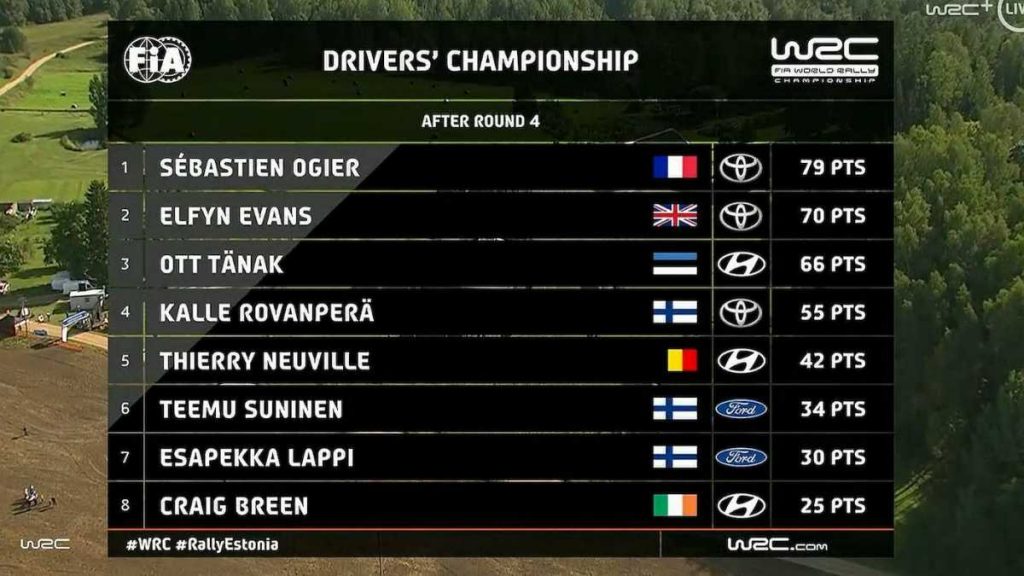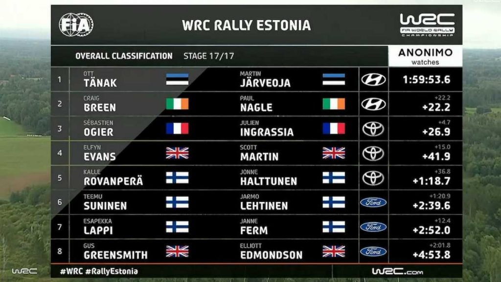 Tänak subió a la tercera posición del campeonato, a 13 puntos del líder Sébastien Ogier. El segundo lugar para un Breen emocional permitió al equipo cerrar la brecha con el líder de la serie de fabricantes Toyota Gazoo Racing a cinco puntos.