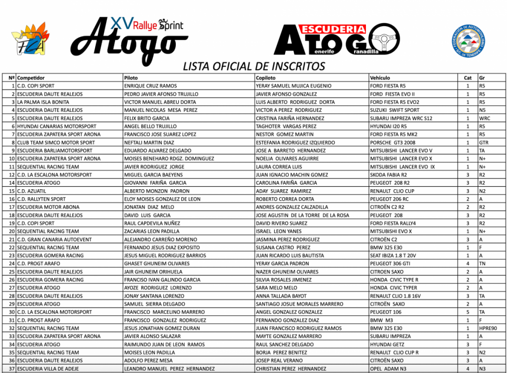 Enrique Cruz (Ford Fiesta R5), partirá con el número 1 en la lista oficial de inscritos del 15º RallySprint Atogo.