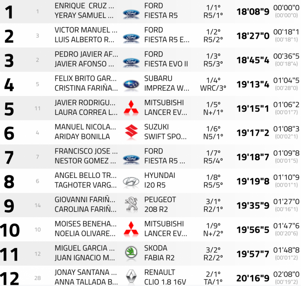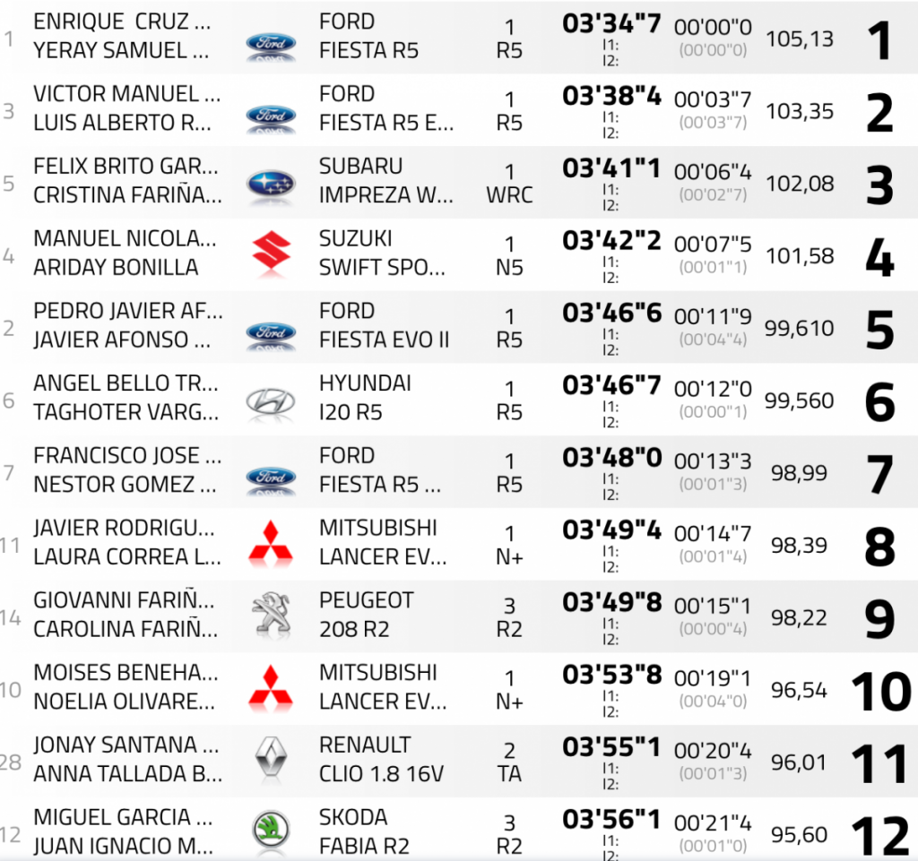 Manolo Mesa – Ariday Bonilla (Suzuki Swift N5 R+) han sido los cuartos mejores, ascendiendo a la sexta plaza de la general después de los problemas sufridos en la anterior pasada, que le hicieron perder su cuarto puesto y bajar hasta la octava plaza.