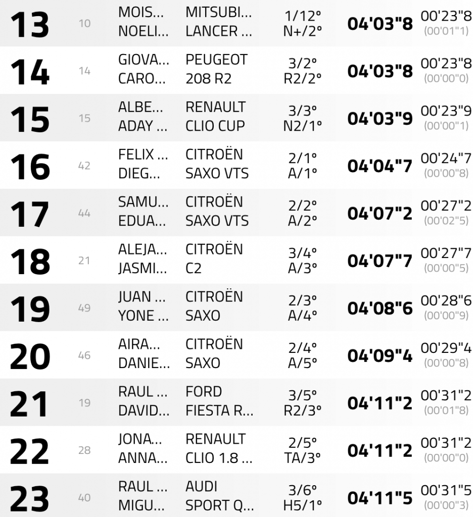 En la décimo tercera plaza están Moisés Beneharo Rodríguez – Noelia Olivares (Mitsubishi Lancer Evo X), empatados a tiempo con Giovanni Fariña – Carolina Fariña, que estrenan el Peugeot 208 R2 con el que Efrén Llanera y Sara Fernández se proclamaron campeones de Europa. Alberto Monzón y Aday Suárez (Renault Clio Cup) son décimo quintos, a solo 0.1 de los dos anteriores. Félix David Alonso – Diego González (Citroën Saxo VTS) son los primeros clasificados de la Copa 16000 y décimo sextos de la general en una muy estrecha lucha con sus compañeros de la Copa Samuel Díaz – Eduardo Agüin (Citroën Saxo VTS), decio séptimos a solo 2.5 de los líderes de la Copa.
