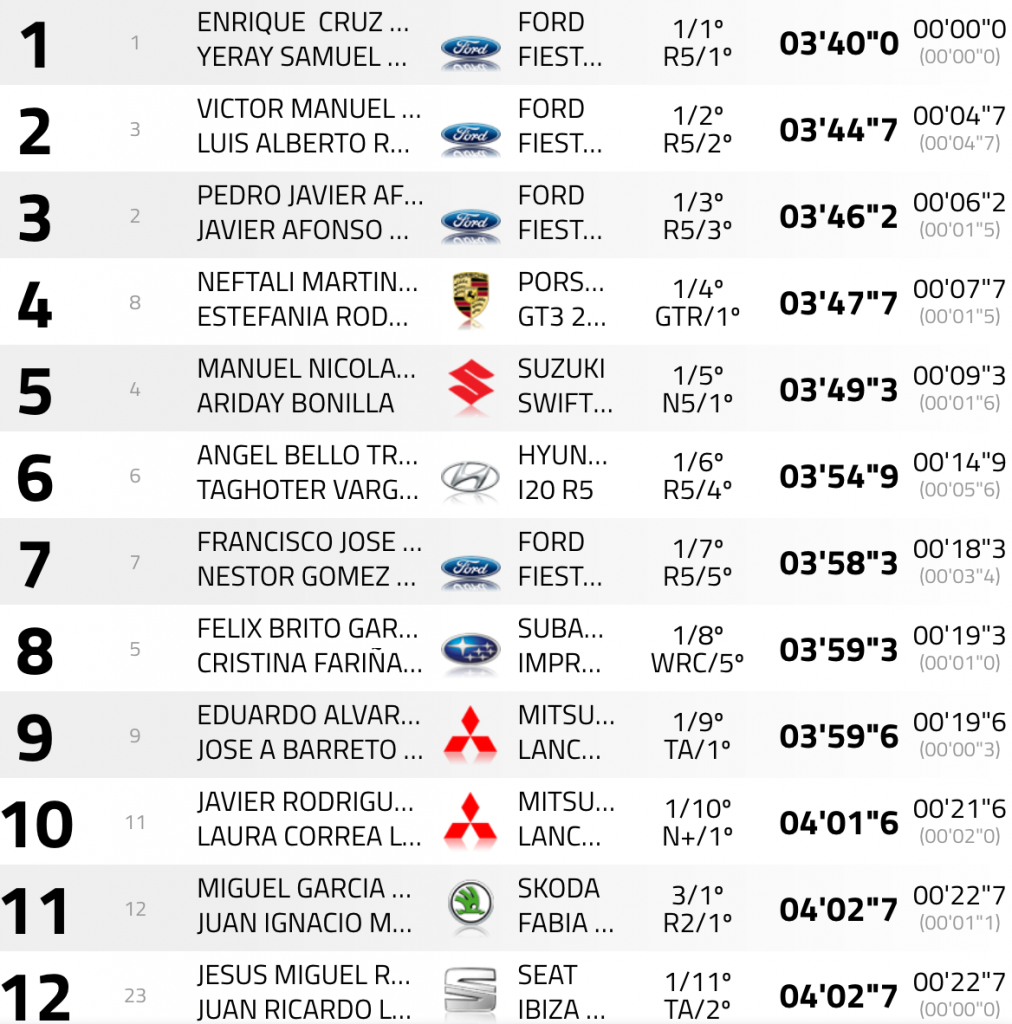 Quintos se sitúan Manolo Mesa – Ariday Bonilla (Suzuki Swift N5 R+), que están a 1.6 del cuarto lugar y superan en 5″6 Ángel Bello – Taghoter Vargas, que en su estreno con el Hyundai i20 R5 se sitúan a 14″9 de la cabeza. También debutan con su nuevo Ford Fiesta R5 Fran Suárez – Néstor Gómez, que son séptimos a 3″4 de los del i20. Con algún susto en el camino y en la octava posición se colocan Félix Brito – Cristina Fariña (Subaru Impreza WRC), que están a solo un segundo de Suárez pero con Eduardo Álvarez – José Barreto (Mitsubishi Lancer Evo V) a solo 0.3. Cierran las diez primeras posiciones Javier Rodríguez – Laura Correa (Mitsubishi Lancer Evo IX), pero a solo 1.1 de los rapidísimos Miguel García – Juan Ignacio Machín (Skoda Fabia R2), undécimos y primeros entre los R2, que están empatados con los sorpresivos Jesús Miguel Rodríguez – Juan Ricardo Luis (Seat Ibiza 1.8 T 20V), que ocupan la décimo segunda posición.