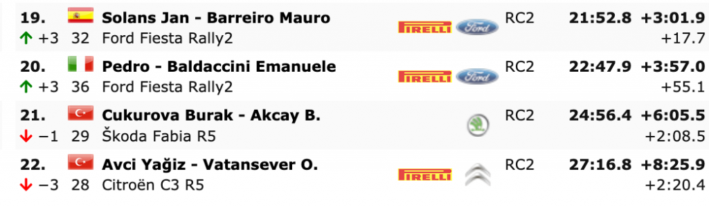 El campeón mundial Ott Tänak fue séptimo en otro i20, con los Fiesta de Esapekka Lappi y Gus Greensmith a continuación. Pierre-Louis Loubet completó la tabla de clasificación con otro Hyundai.
