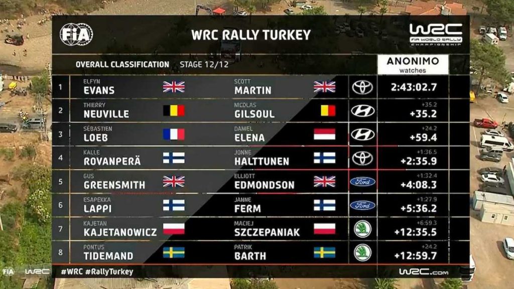Kalle Rovanperä terminó cuarto, a más de 90 segundos por detrás de Loeb después de haber sido víctima de la maldición de Çetibeli. Los puntos obtenidos por Evans y el joven finlandés permiten a Toyota Gazoo Racing ampliar su ventaja en el campeonato de constructores con nueve puntos de ventaja sobre Hyundai Motorsport.