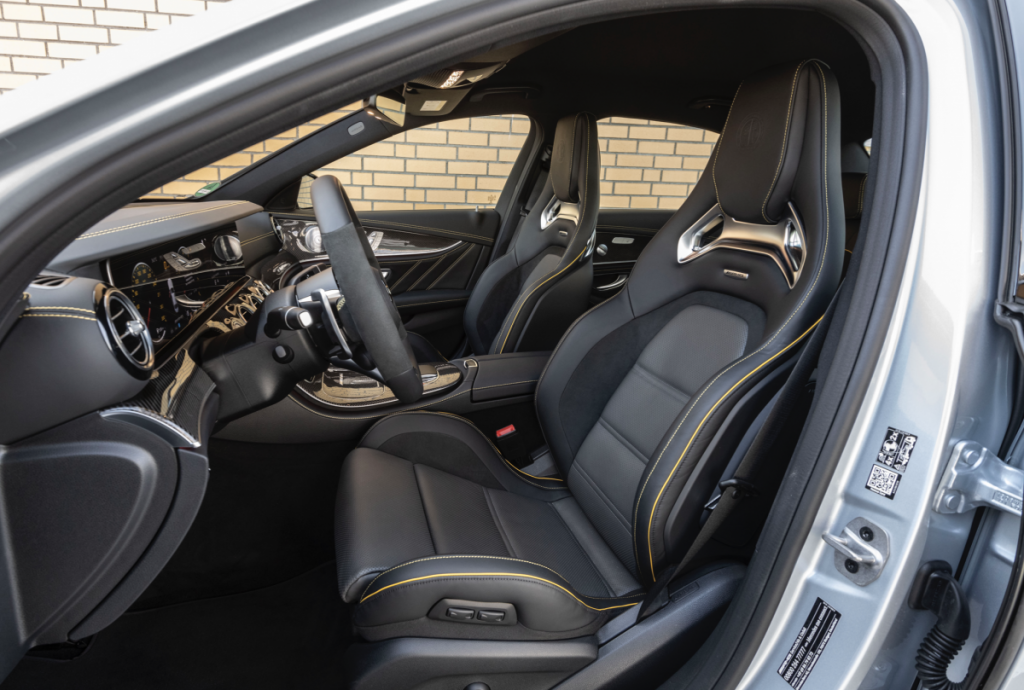El interior conjuga el ambiente noble y los materiales de alta calidad con las altas prestaciones características de AMG. Los asientos deportivos AMG combinan una buena sujeción lateral con un confort elevado en viajes largos y disponen de módulos de acolchado específicos AMG con placas «AMG» en los respaldos delanteros. Un rasgo distintivo de los modelos E 53 es el tapizado de símil de cuero ARTICO/microfibra DINAMICA en negro con configuración AMG, costuras de adorno en color de contraste rojo y placa AMG. Los modelos de ocho cilindros equipan de serie asientos con tapizado de cuero, y para todos los modelos se ofrecen opcionalmente diferentes variantes de cuero. También pueden encargarse como equipo opcional asientos AMG Performance con reposacabezas integrados y sujeción lateral mejorada. Los responsables de producto han depurado aún más la estética interior de la variante E 63 S. Entre otros, con revestimientos de napa en el tablero de instrumentos y las líneas de cintura y con cinturones de seguridad de color gris cristal. El programa de tapizados incluye una nueva ejecución, específica de AMG: napa negro/gris titanio pearl con costura de adorno en color de contraste amarillo. El equipamiento de serie incluye además la iluminación de ambiente con posibilidades individuales de ajuste.