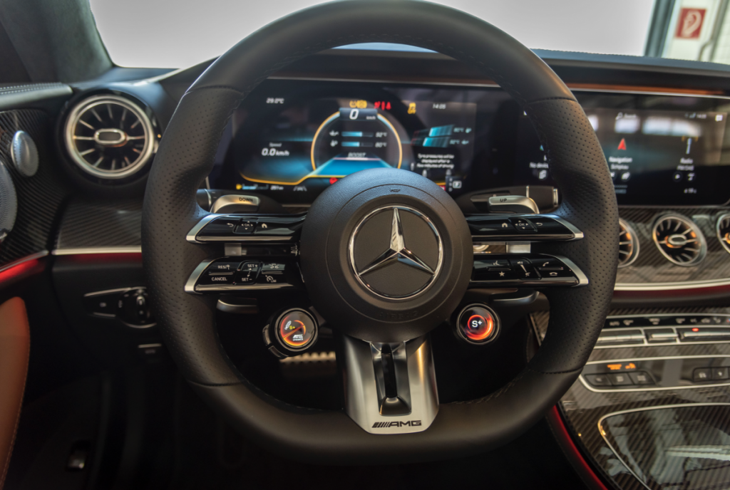 Otro equipo destacado es el sistema de infoentretenimiento MBUX con pantalla táctil y panel táctil, mando fónico inteligente e indicaciones y ajustes específicos de AMG. Los dos visualizadores —para el cuadro de instrumentos y para las funciones multimedia— se funden a la vista bajo una sola cubierta de cristal, configurando así un puesto de conducción widescreen. En el modelo S equipa de serie pantallas de 12,25 pulgadas. Para la visualización del cuadro de instrumentos, el cliente puede alternar entre tres estilos de visualizado AMG: «Modern Classic», «Sport» y «Supersport». Especialmente llamativo resulta el modo «Supersport», con cuentarrevoluciones redondo en posición central, flanqueado por indicadores horizontales representados en perspectiva para crear una impresión tridimensional.