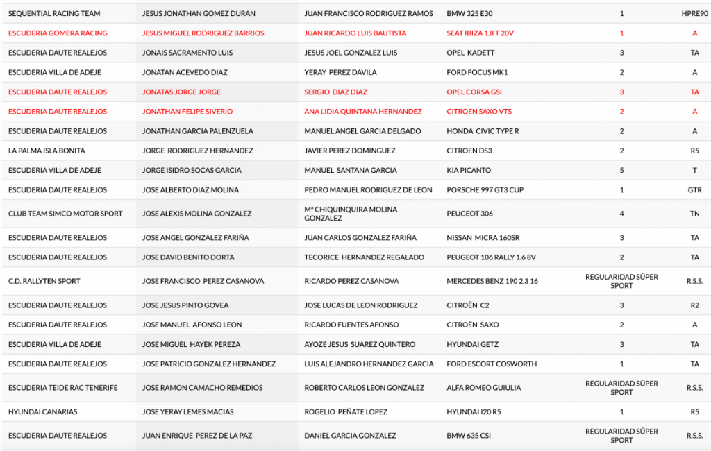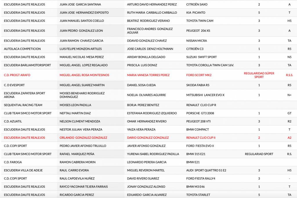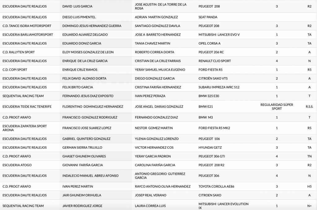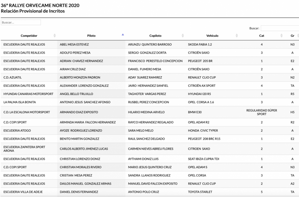 Publicamos la lista provisional de inscritos del Rally Orvecame Norte, segunda cita del Campeonato de Canarias de Rallys de Asfalto 2020, donde están Enrique Cruz – Yeray Mujica (Ford Fiesta R5), Luis Monzón – José Carlos Déniz (Citroën C3 R5), Miguel Suárez – Dani Sosa (Skoda Fabia R5), Yeray Lemes – Rogelio Peñate (Hyundai i20 R5), Pedro Javier Afonso – Javier Afonso (Ford Fiesta R5), Félix Brito – Cristina Fariña (Subaru Impreza WRC), Ángel Bello – Taghoter Vargas (Hyundai i20 R5), Manolo Mesa – Ariday Bonilla (Suzuki Swift N5 R+), Jorge Rodríguez – Javier Pérez (Citroën DS3 R5), Fran Suárez – Néstor Gómez (Ford Fiesta R5), Neftalí Martín – Estefanía Rodríguez (Porsche 911 GT3), Víctor Delgado – Nazer Ghuneim (Mitsubishi Lancer Evo IX) Eduardo Álvarez – José Barreto (Mitsubishi Lancer Evo V), Javier Rodríguez – Laura Correa (Mitsubishi Lancer Evo IX), entre otros.