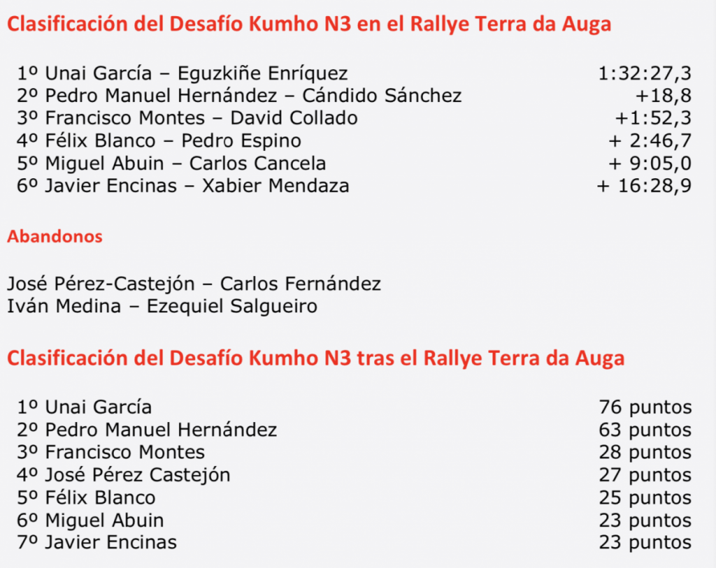 El podio lo completaban Francisco Montes y David Collado tras hacer una jornada muy sólida. Cuartos eran Félix Blanco y Pedro Espino, con Miguel Abuin y Carlos Cancela en quinta posición, y Javier Encinas y Xabier Mendaza completando la clasificación del Desafío Kumho N3.
