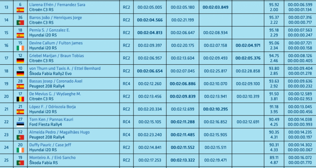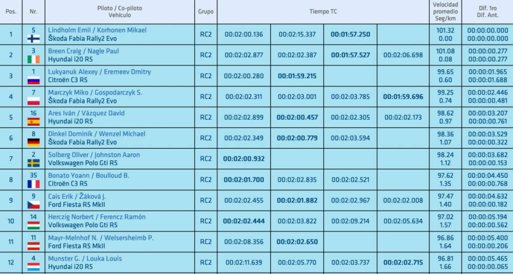 Los fineses realizaron tres pasadas para marcar un mejor crono de 1:57.250, seguidos de los irlandeses Craig Breen y Paul Nagle (Hyundai i20 R5), que después de tres pasadas, marcaron un mejor crono de 1:57.527, quedándose a 0.277 del mejor crono.