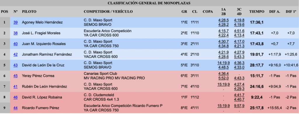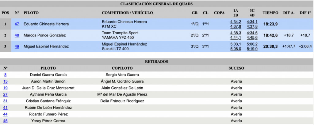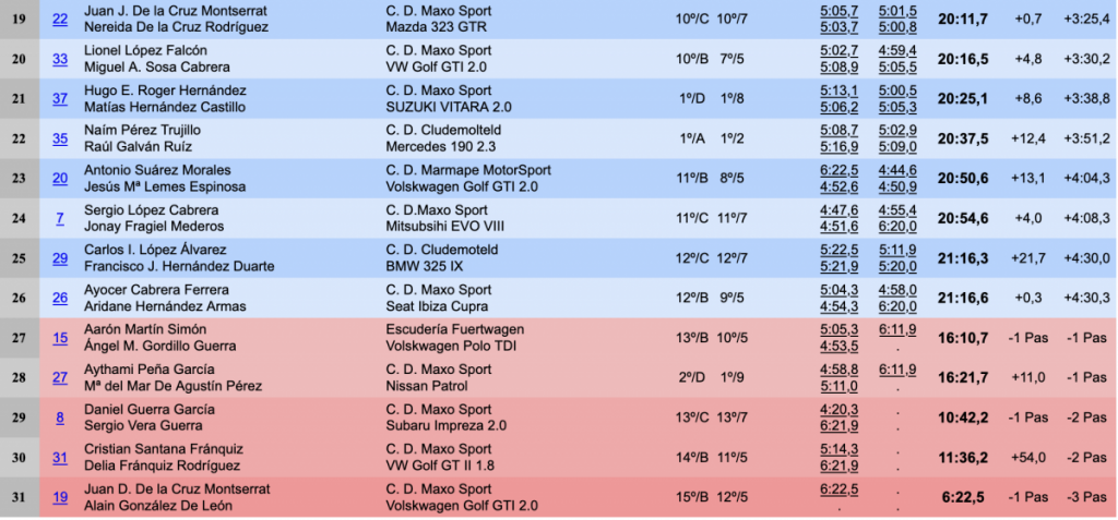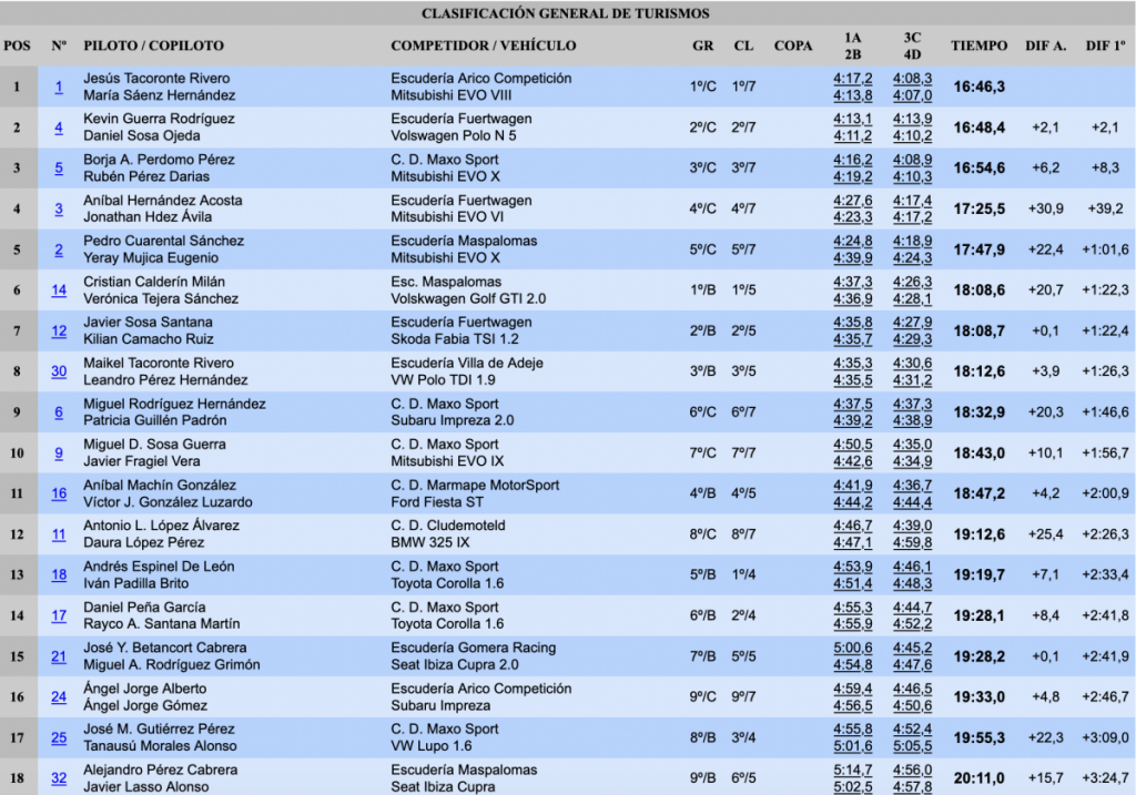 Quintos fueron los grancanarios Pedro Cuarental Yeray Mujica (Mitsubishi Lancer Evo X), muy alejados de la cabeza, a 1:01.6 y a 22.4 de la cuarta plaza, seguidos de sus paisanos Cristian Calderín y Verónica Tejera (Volskwagen Golf GTI 2.0).