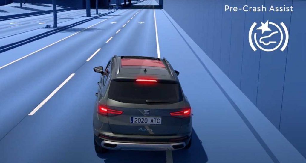 Protegido ante una posible colisión. Cuando el accidente es ya inevitable, lo más importante es procurar la protección de los ocupantes del vehículo. Para ello, se ha creado el asistente pre-colisión del nuevo Ateca. Ante un potencial riesgo de colisión, los sistemas a bordo trabajan conjuntamente y preparan el vehículo para un hipotético impacto: “Activa las luces de emergencia, tensa los cinturones de seguridad reversibles y cierra las ventanas para paliar las consecuencias de un accidente”, explica Marc Seguer de SEAT.