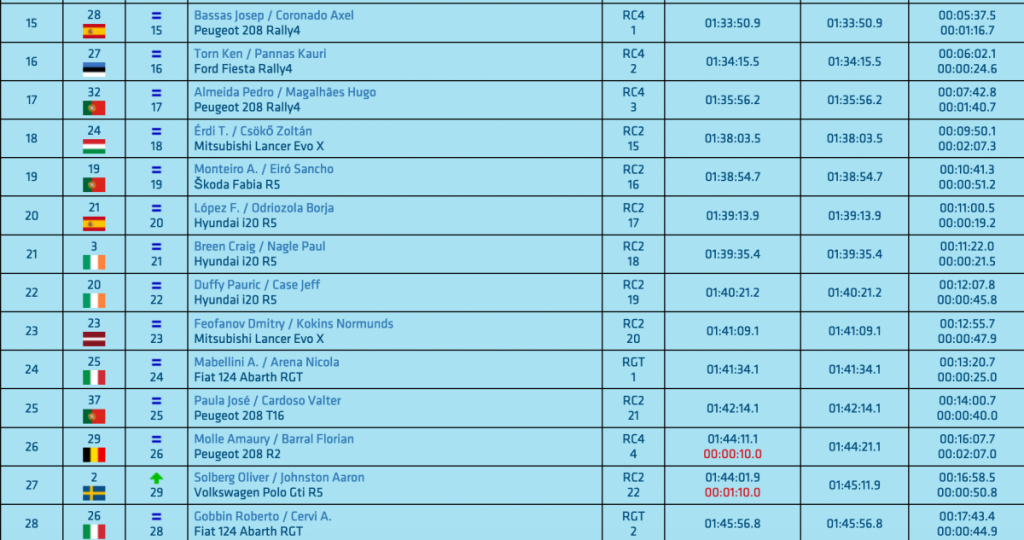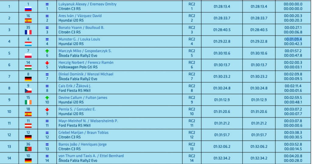 Con los rusos Alexey Lukyanuk y Dmitry Eremeev (Citroën C3 R5) instalados en la primera posición y administrando renta, que es de 20.3 a falta de tres tramos, Bonato se puso segundo tras empezar fuerte el día en los tres tramos de la mañana, pero el gallego Ares, que ha ganado el sexto tramo del día, siendo segundo en el cuarto y quinto, tras Lukyanuk y un descolgados Oliver Solberg y Aaron Johnston (Volkswagen Polo GTI R5), ha propiciado que recupere el segundo lugar y aventaje ahora a Bonato en 6.8 a falta de los tres tramos finales de la cita lusa.