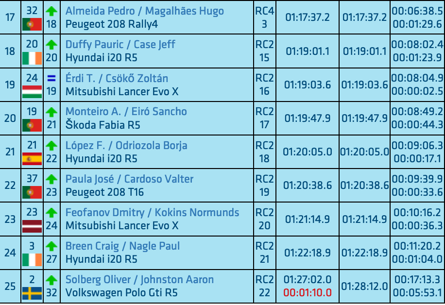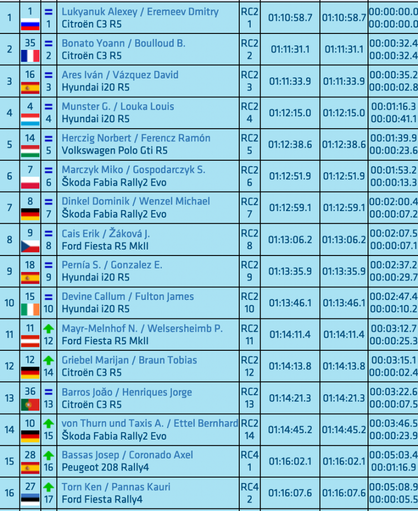 Al segundo lugar de la general han ascendido los galos Yoann Bonato y B. Boulloud (Citroën C3 R5), que marcaron el mejor crono en la primera especial de la jornada, acompañado de un cuarto y tercer mejor crono en las dos siguientes cronos, lo que le vale para superar a los españoles Iván Ares y David (Hyundai i20 R5), terceros, en 2.8, por lo que la lucha por la segunda posición está totalmente abierta en las seis especiales restantes entre estos dos equipos puesto que el cuarto lugar, en manos de los líderes del ERC1 Junior, los holandeses Grégoire Munster y Louis Louka (Hyundai i20 R5, está a 41.1 del último escalón del podio.